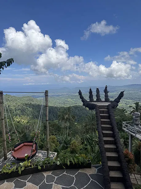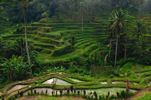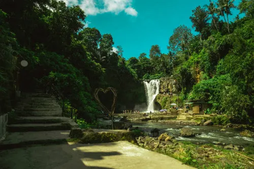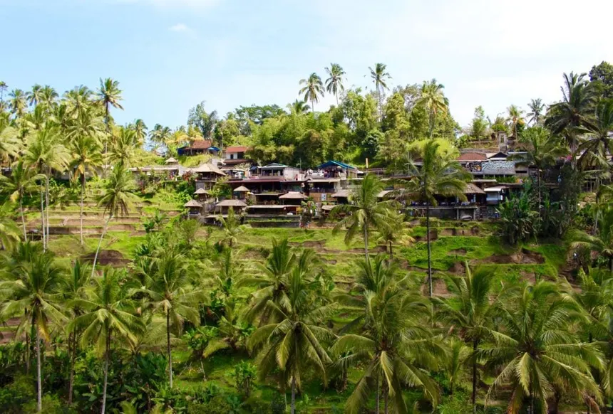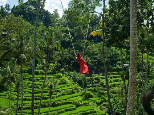 Transfer to Ubud. Sightseeing includes Tegenungan Waterfall, Rice Terrace exploration, and the Kintamani View of the volcano. Check-in to your Ubud hotel (Ubud Wana/Evitel or Similar, 4 star).